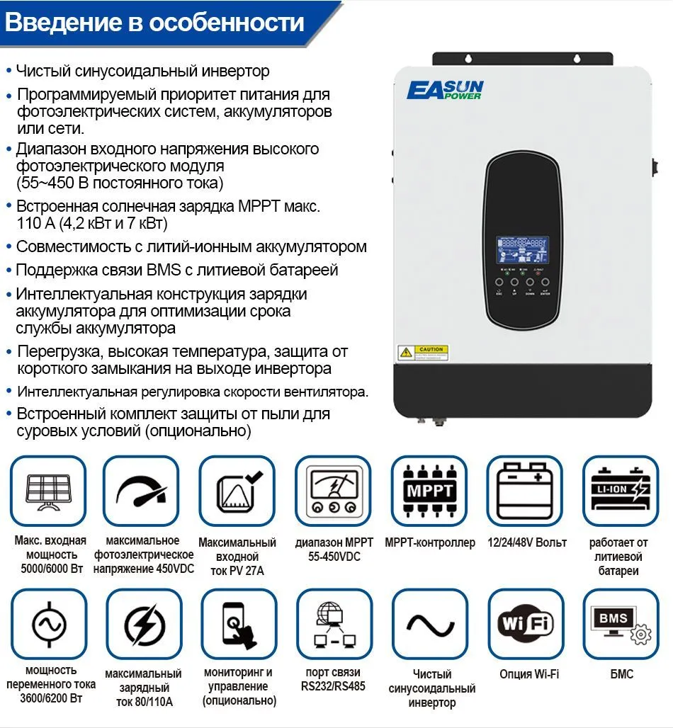 Гібридний інвертор EASUN POWER 7000VA(6200W) з модулем Wi-Fi 110A MPPT (безперебійник, UPS, ДБЖ)