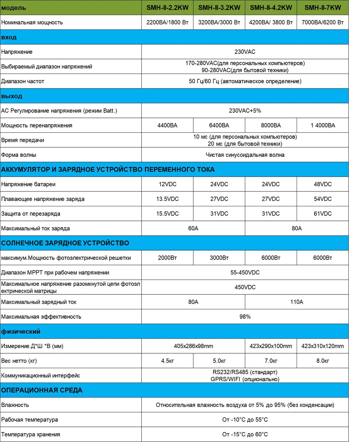 Артикул 1248283988 Тип Інвертор для сонячних панелей Номінальна потужність, Вт 6200 Партномер ISolar-SMH-II-7KW Гарантія 1 рік Кількість фаз Однофазний Тип інвертора гібридний Колір Білий Країна-виробник Китай Напруга акумулятора 48 В Напруга 230 В